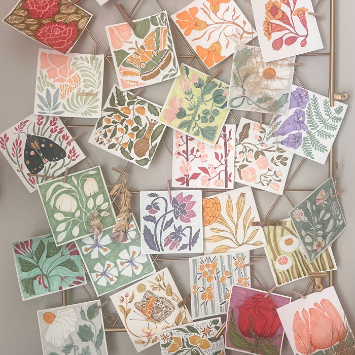 Hello. Welcome to my home studio filled with plants, paints, and tiny treasures. I hand-illustrate every piece of nature-inspired artwork.