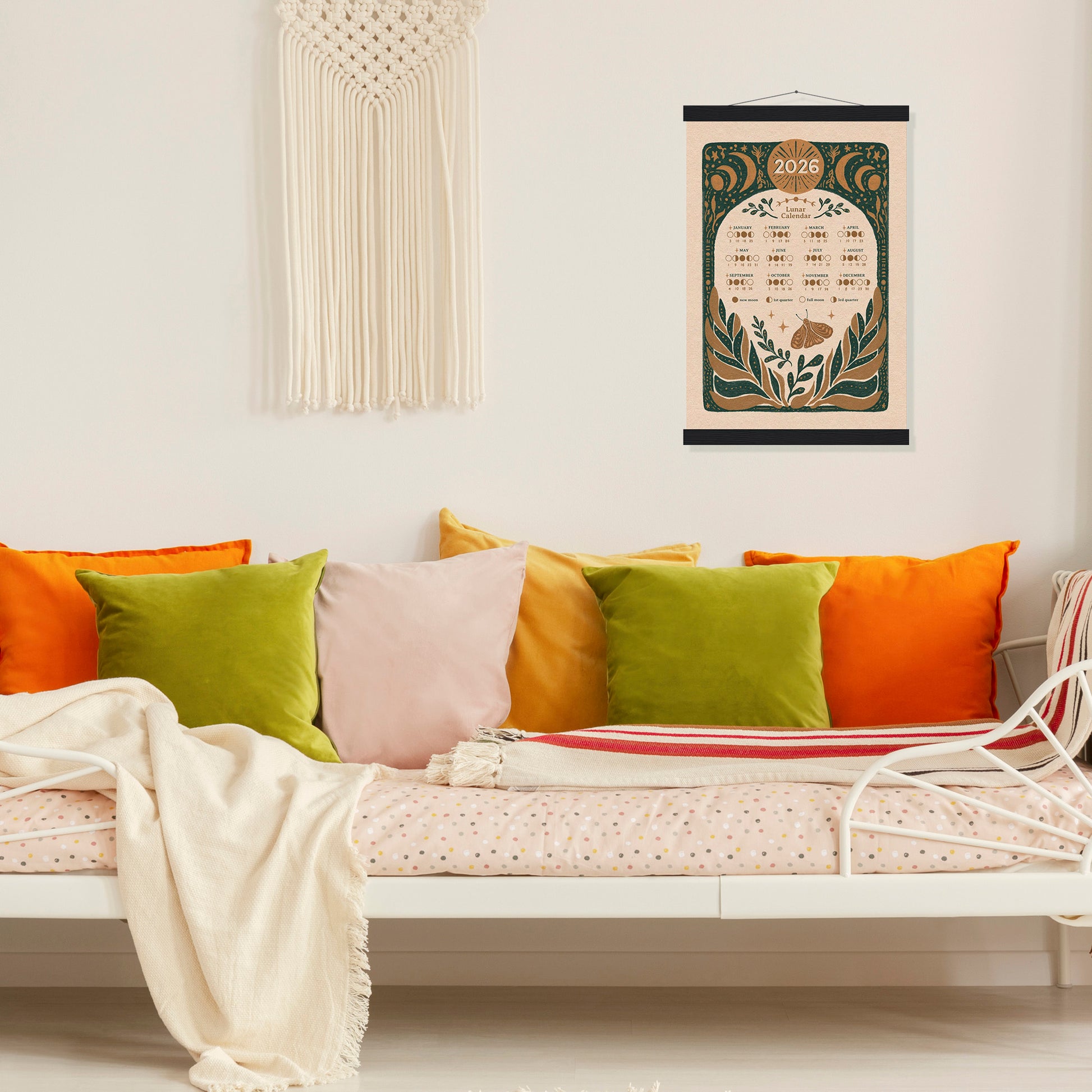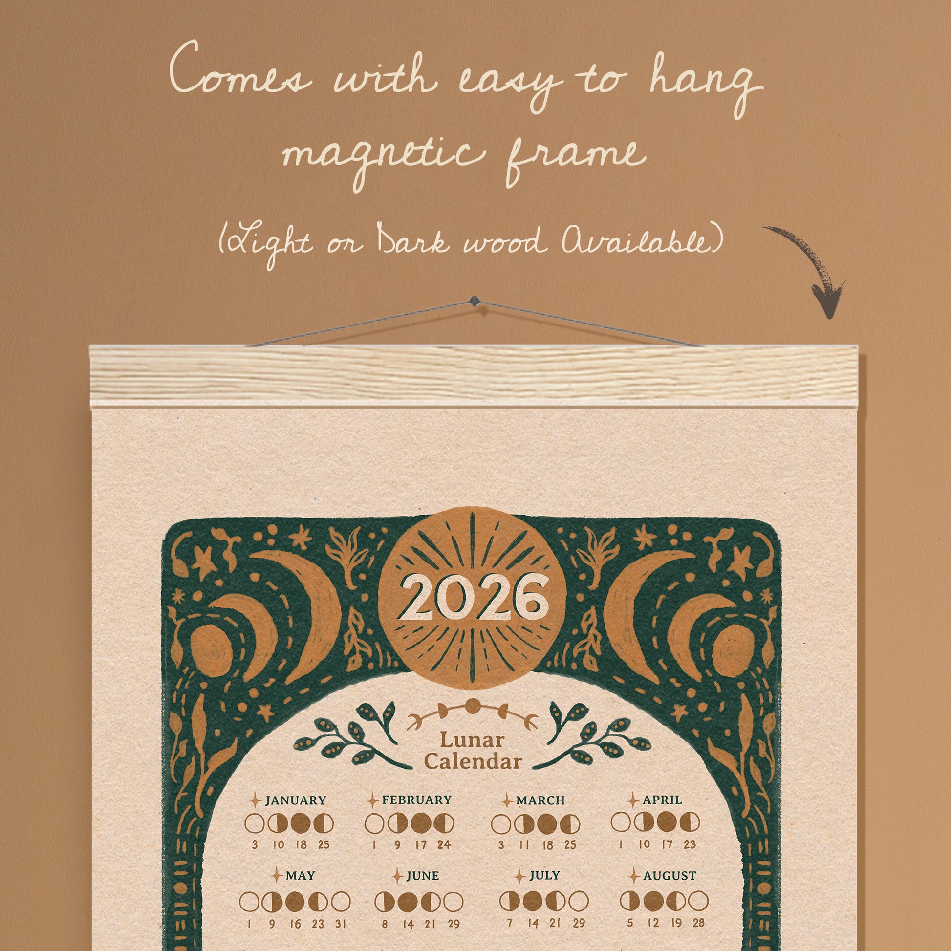 The print comes with easy-to-use magnetic, wooden hangars. They can be reused when the year is up. Makes the perfect gift for the moon lover in your life!