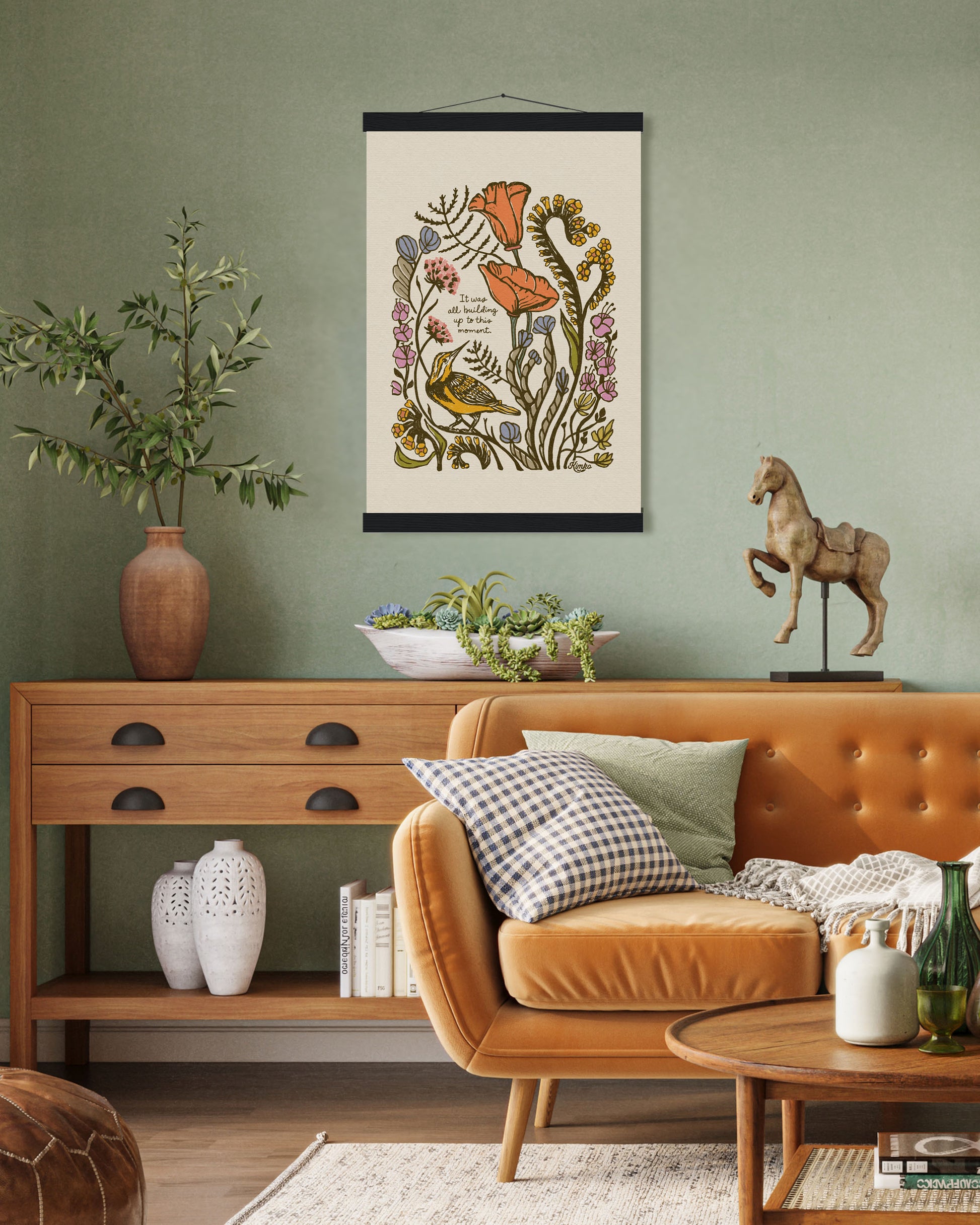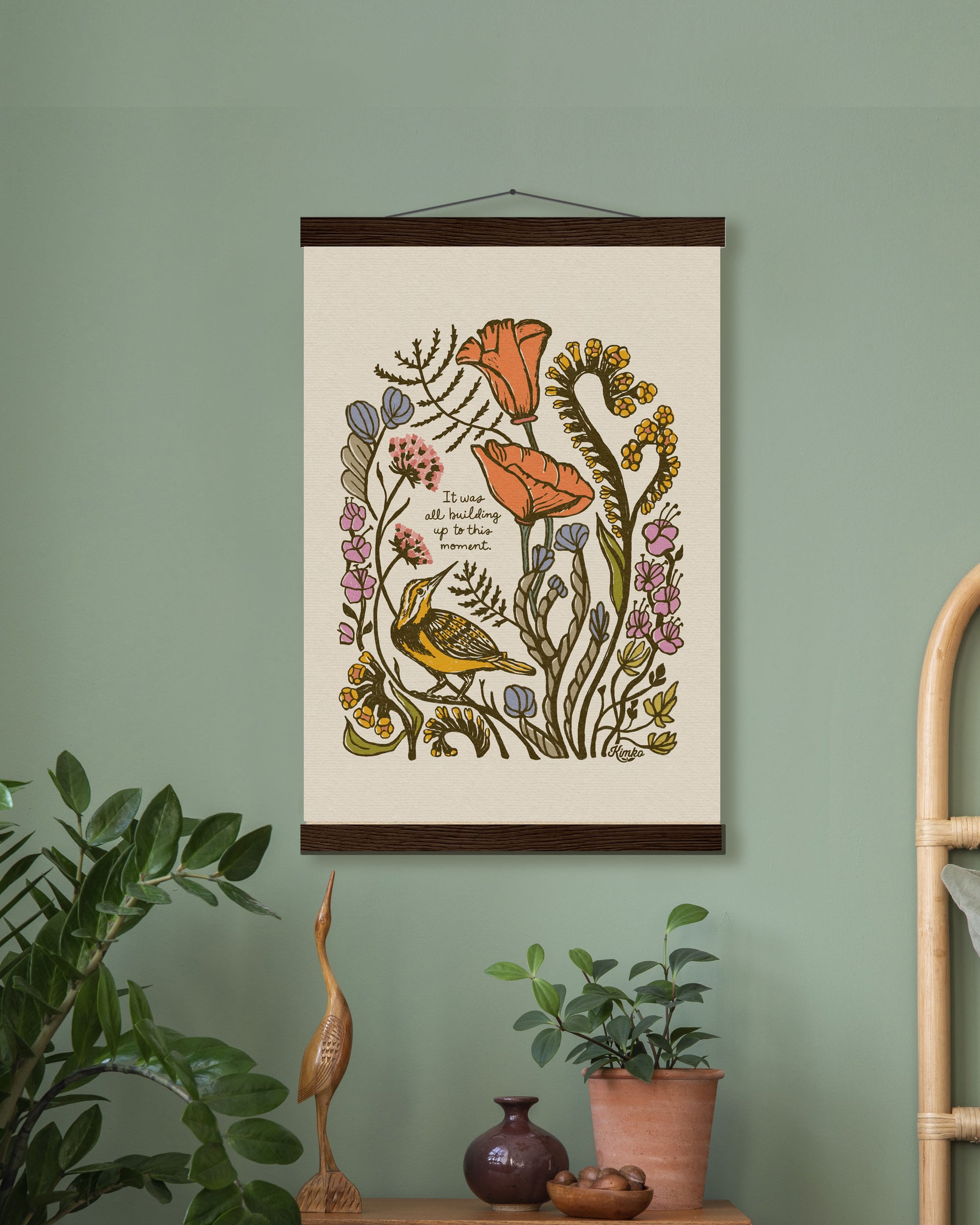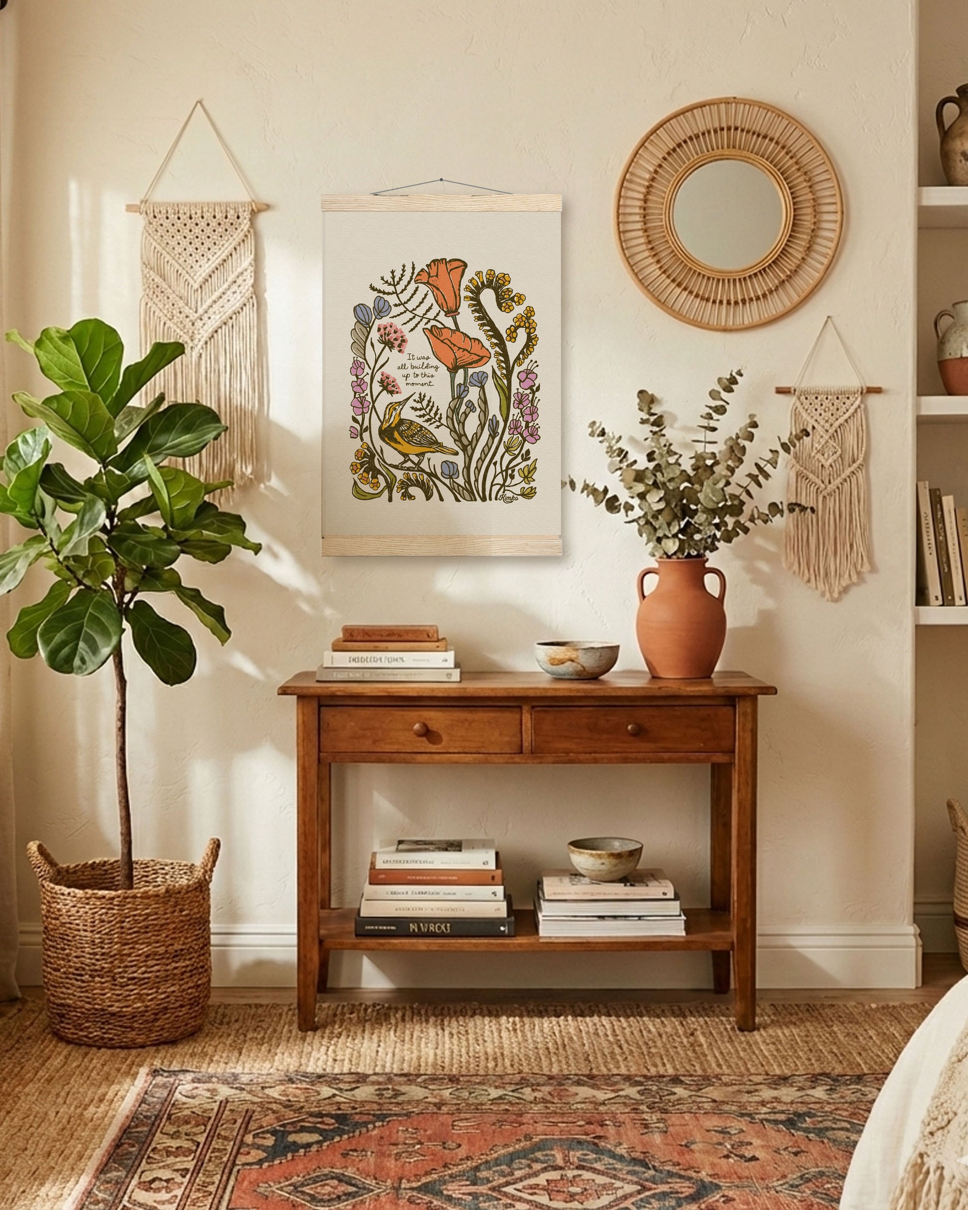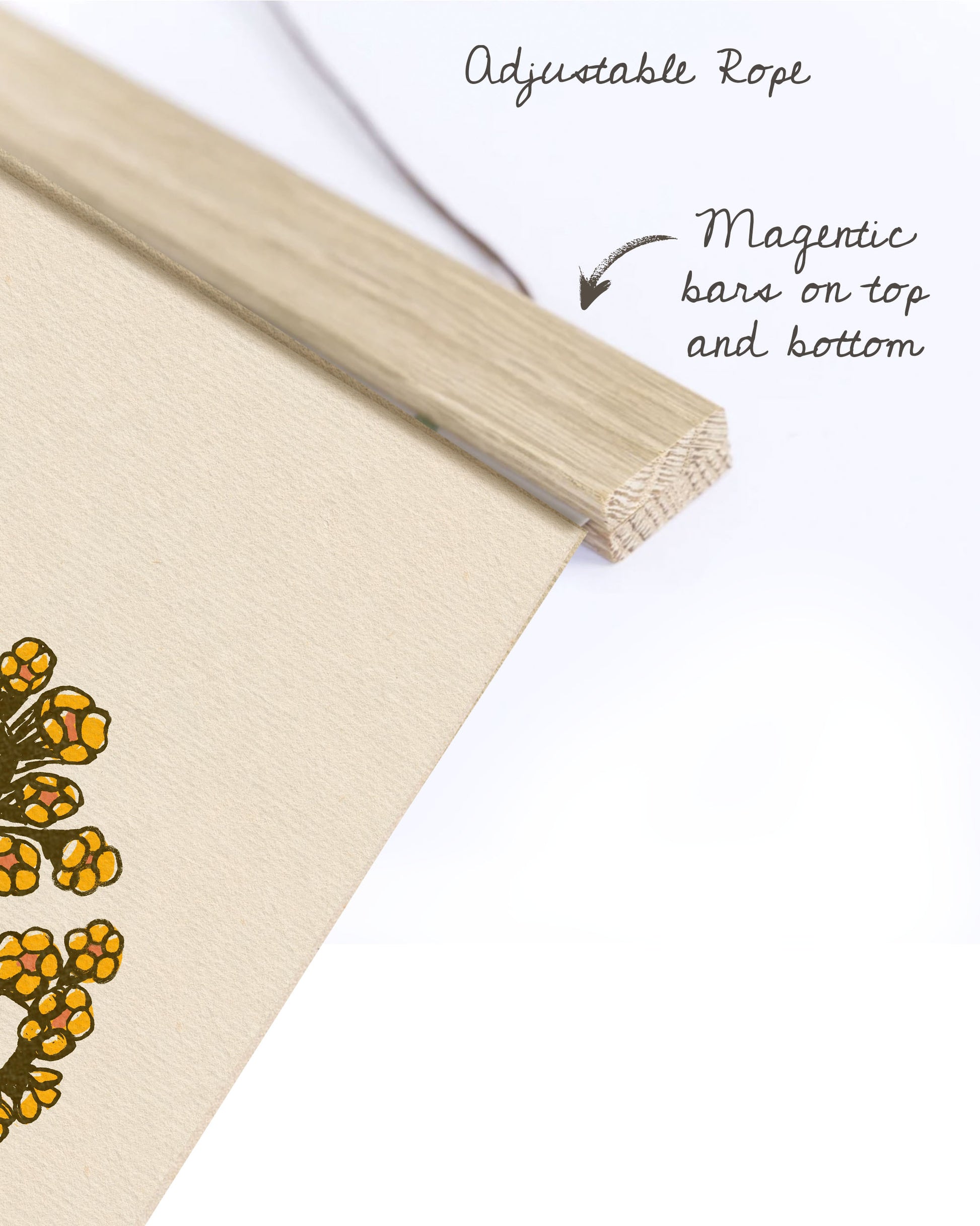 Your print comes ready to hang with magnetic wooden hangers — no frame hunting necessary. They bring a warm, bohemian touch that pairs beautifully with any space.