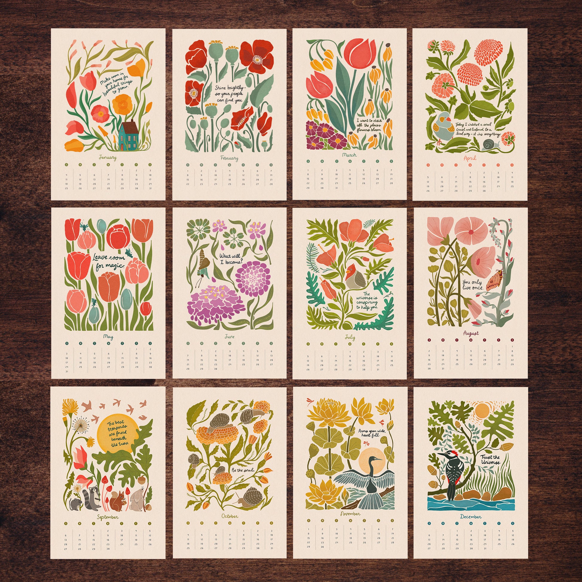 This 12-month botanical calendar features original artist-illustrated nature artwork paired with quotes. A perfect blend of floral art, mindful living, and daily inspiration. It’s a beautiful wall calendar for nature lovers, gardeners, and anyone who wants to bring more magic into their home or office.