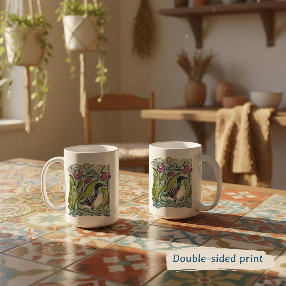 It features the Minnesota state bird - the loon, and the Minnesota state flower - lady slippers.