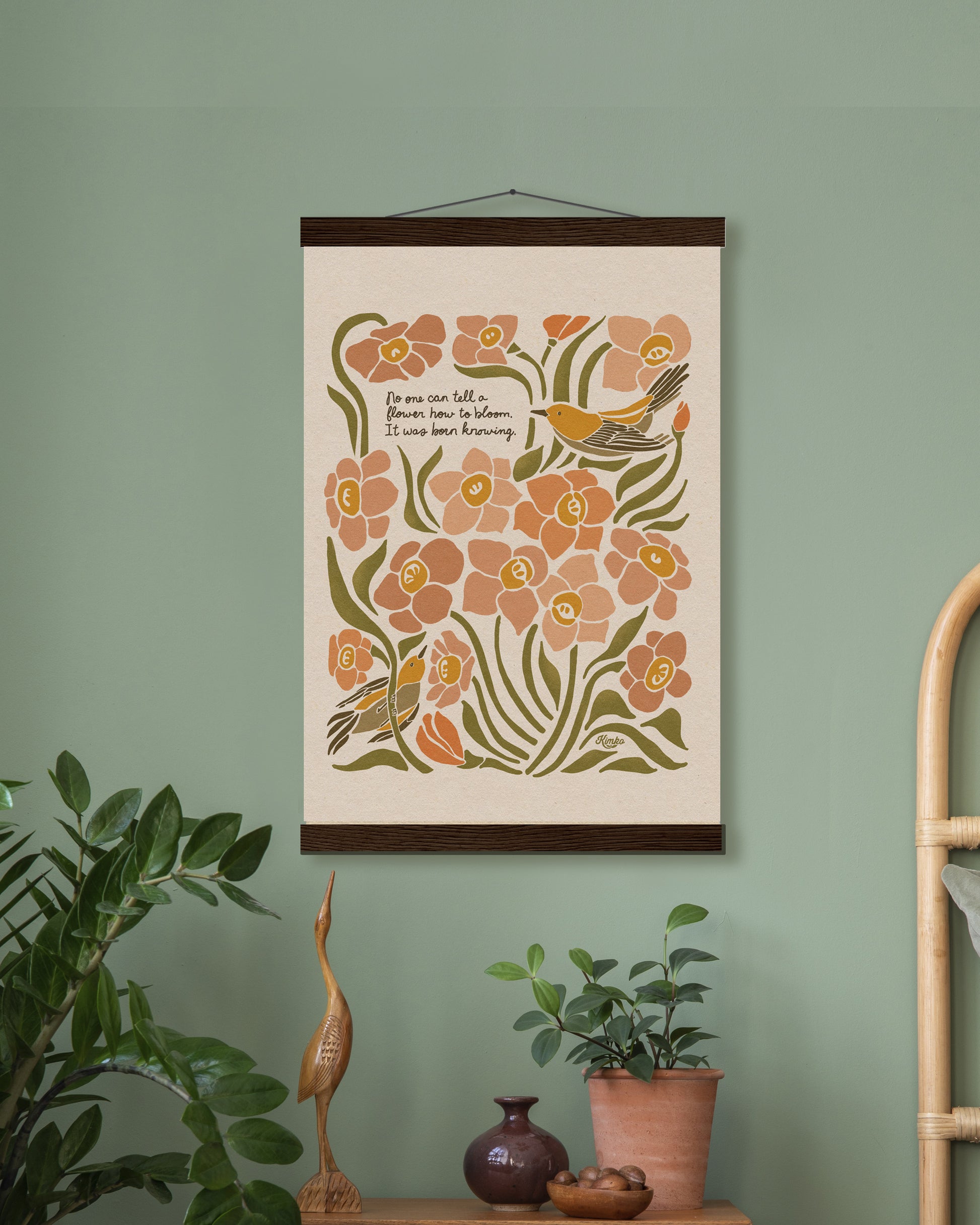 Your print comes ready to hang with magnetic wooden hangers — no frame hunting necessary. They bring a warm, bohemian touch that pairs beautifully with any space.